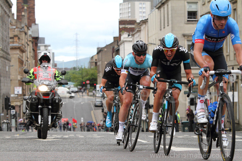 David Millar, Peter Kennaugh, Mark Cavendish & Ben Swift chase race leaders Andrew Fenn & Ian Stannard through Blythswood Square at 20 seconds… Bicycle racing Scottish style…