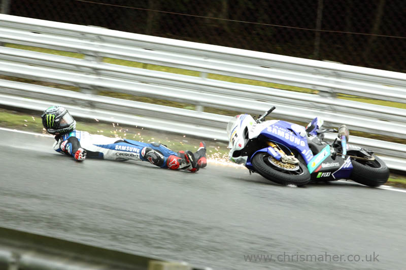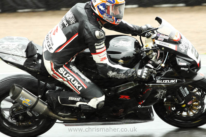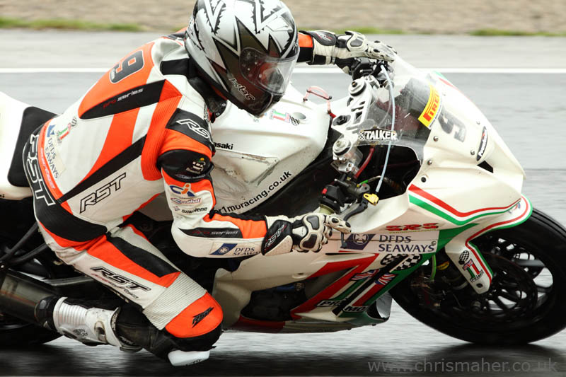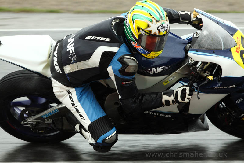 But things were going to be different this time round. During the warm up session, several riders slid off including Team WFR Racing’s Graeme Gowland, and Pr1mo Racings Chris Walker who fell heavily a Lodge Corner almost destroying his bike. The track was rather wet then, and continued to rain with only an hour to the first race, it was almost certainly going to be declared wet.
