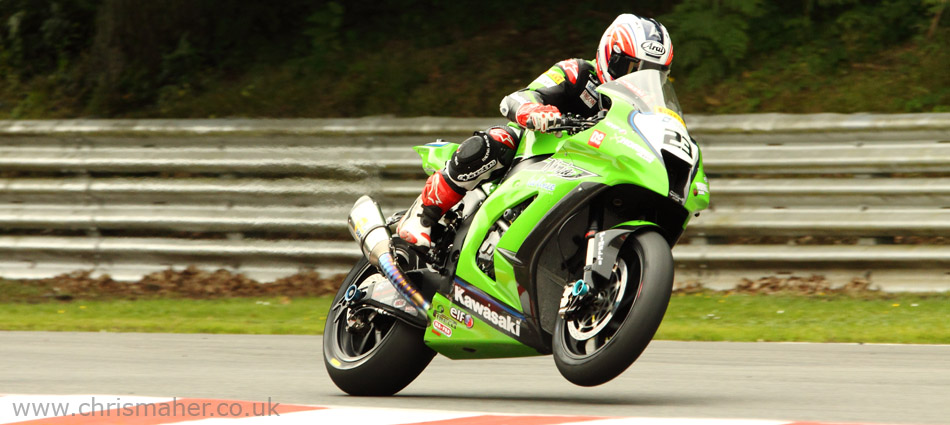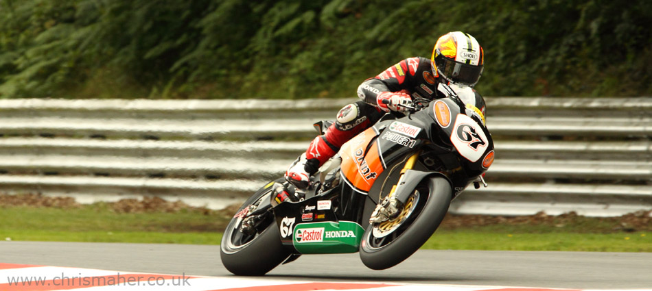 Light rain and drizzle just before race 1 delayed the start. A 7 min wet practice session was declared, but most riders declined the offer. The race was won by making the right tyre choice, and for many, the wrong decision was made. Big losers included Tommy Hill, Shane Byrne & Michael Laverty. John Hopkins managed to hang onto his fourth position as many of the riders stopped for replacement tyres & Tommy Hill profited by posting the quickest lap and pole position for race 2. A good start by the guest World Super Bike Rides also decayed as the track dried up.