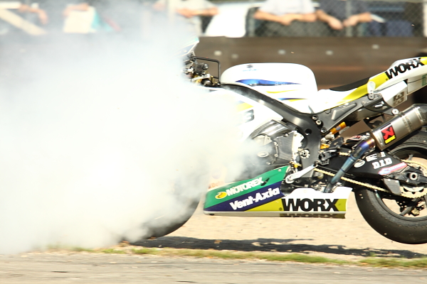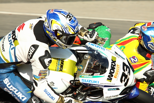 Laverty opened up the challenge & lunged into the first corner. Hill & Laverty jostled positions over the first couple of laps before Ellison moved into 2nd behind Hill. Soon after Kiyonari moved into 3rd, then Ellison & Hill took turns leading. As Ellison lead into Lodge Corner on lap 7, Worx Suzuki’s Tommy Hill under braked up the inside, & both rides slide off the track. Ellison called it a day as Hill got his machine re-started & joined the back markers. By this point both the HM Plant boys & Relentlass Suzuki’s Michael Laverty were well on their way around the track. Laverty then crashed out at the Old Hall.