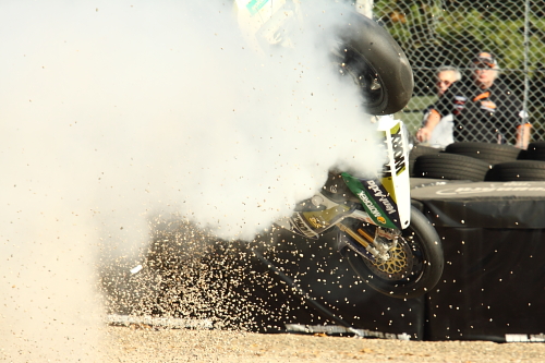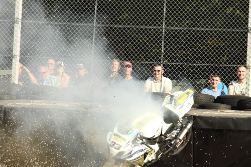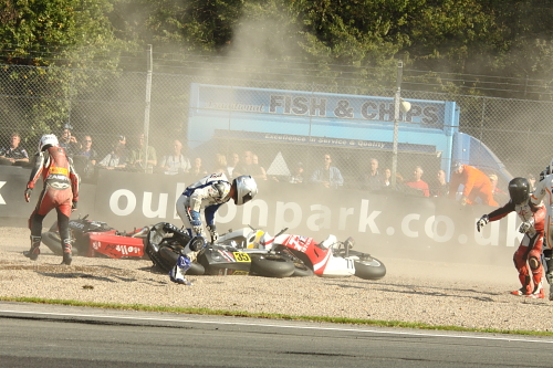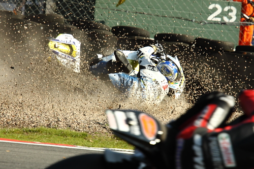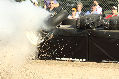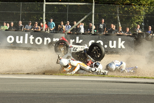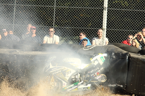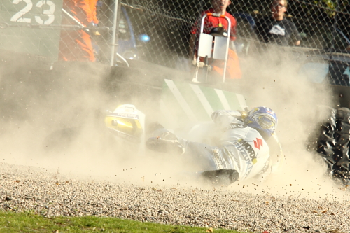 Hill, now well out of the points worked his way through the field, but upon returning to Lodge Corner on the following lap found he had no front brake, & travelling at some speed decided to ditch his machine. Hill’s bike bounced several times before catching fire in the perimeter padding. The following rides, Zanoti, Burns, Seaton & Pekkanen slid through the debris & smoke, & the Race got Red Flagged.